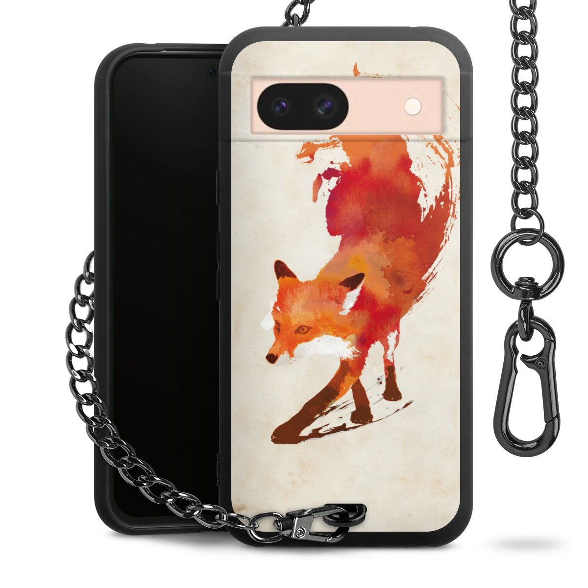 Die Handyhülle verfügt über eine mittig am unteren Rand platzierte Öse, an der die Metallkette stabil befestigt ist. Bestelle die Hülle einfach für Dein Smartphone-Modell, dann passt sie wie angegossen und Du brauchst sie bloß einmal anzudrücken. Handy in die Tasche, Karabiner an den Hosenbund – schon kann die Party starten.