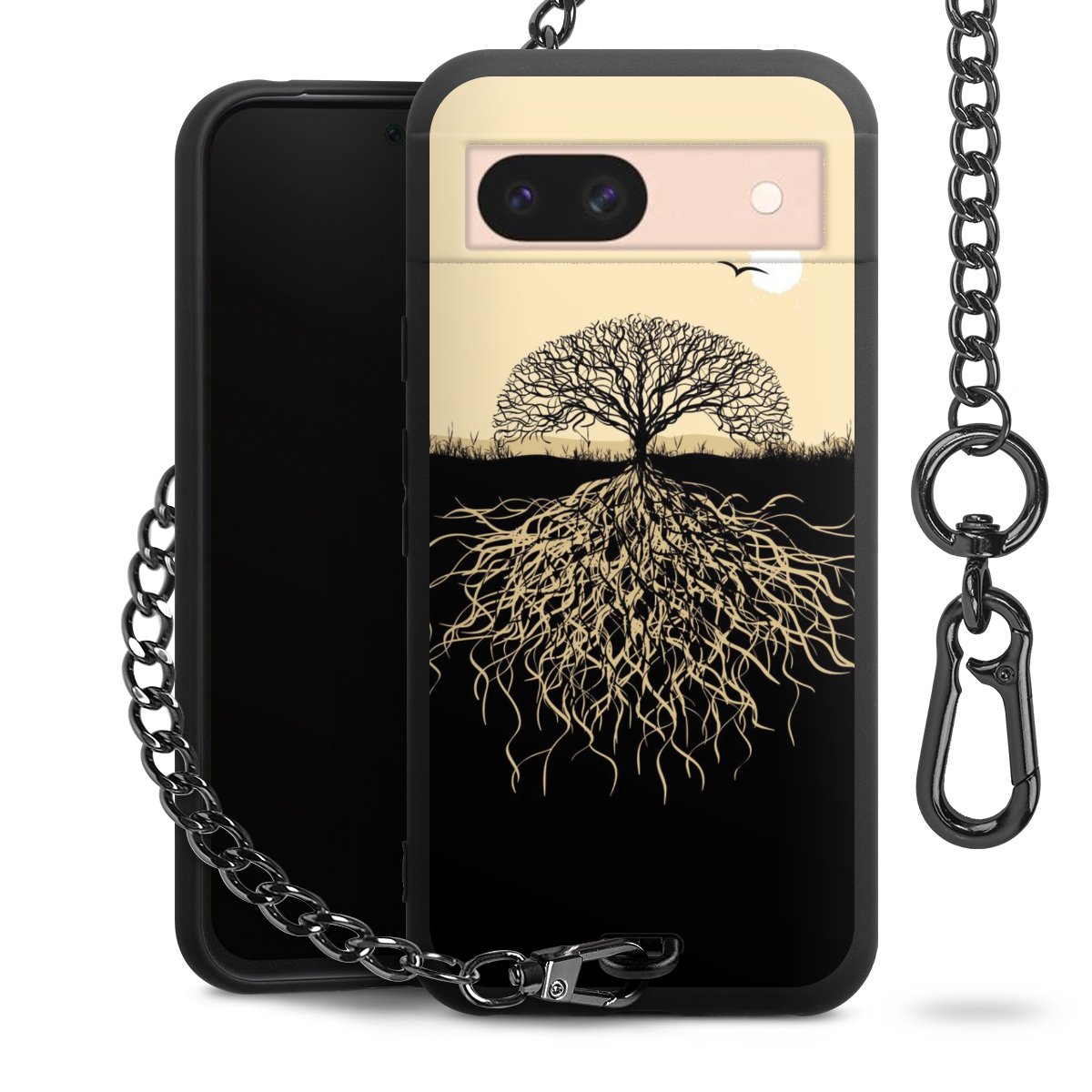 Die mattschwarze Silikon-Handyhülle besteht aus robustem TPU (thermoplastisches Polyurethan). Sie ist flexibel und schützt Dein Smartphone vor Stößen und Kratzern. Die Kette sowie der Karabinerhaken sind aus Metall in Gunmetal-Optik gefertigt. Für dieses Produkt kommen ausschließlich TÜV-geprüfte Materialien zum Einsatz.