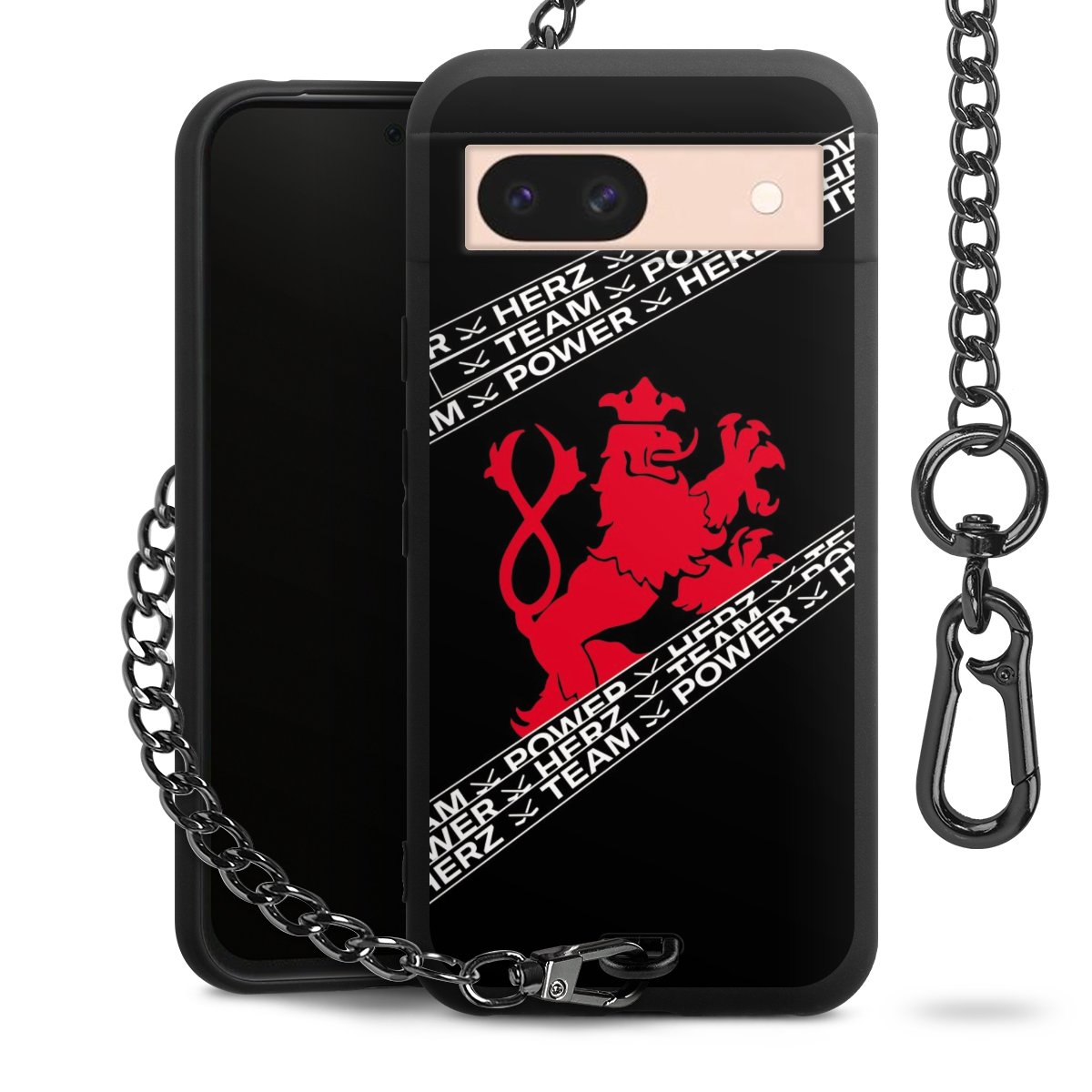 Die mattschwarze Silikon-Handyhülle besteht aus robustem TPU (thermoplastisches Polyurethan). Sie ist flexibel und schützt Dein Smartphone vor Stößen und Kratzern. Die Kette sowie der Karabinerhaken sind aus Metall in Gunmetal-Optik gefertigt. Für dieses Produkt kommen ausschließlich TÜV-geprüfte Materialien zum Einsatz.