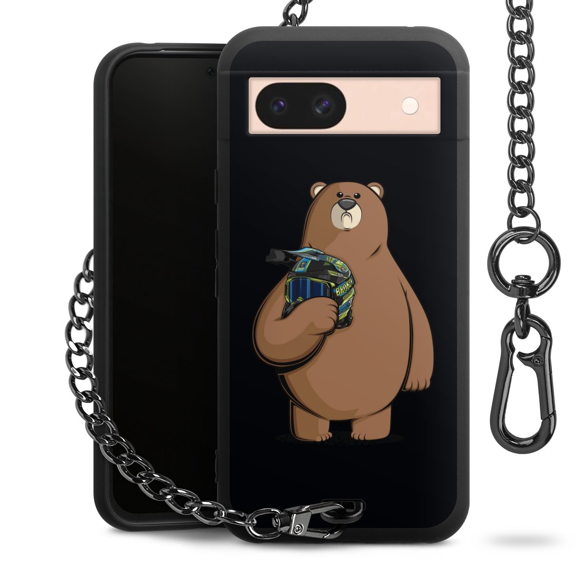 Die mattschwarze Silikon-Handyhülle besteht aus robustem TPU (thermoplastisches Polyurethan). Sie ist flexibel und schützt Dein Smartphone vor Stößen und Kratzern. Die Kette sowie der Karabinerhaken sind aus Metall in Gunmetal-Optik gefertigt. Für dieses Produkt kommen ausschließlich TÜV-geprüfte Materialien zum Einsatz.