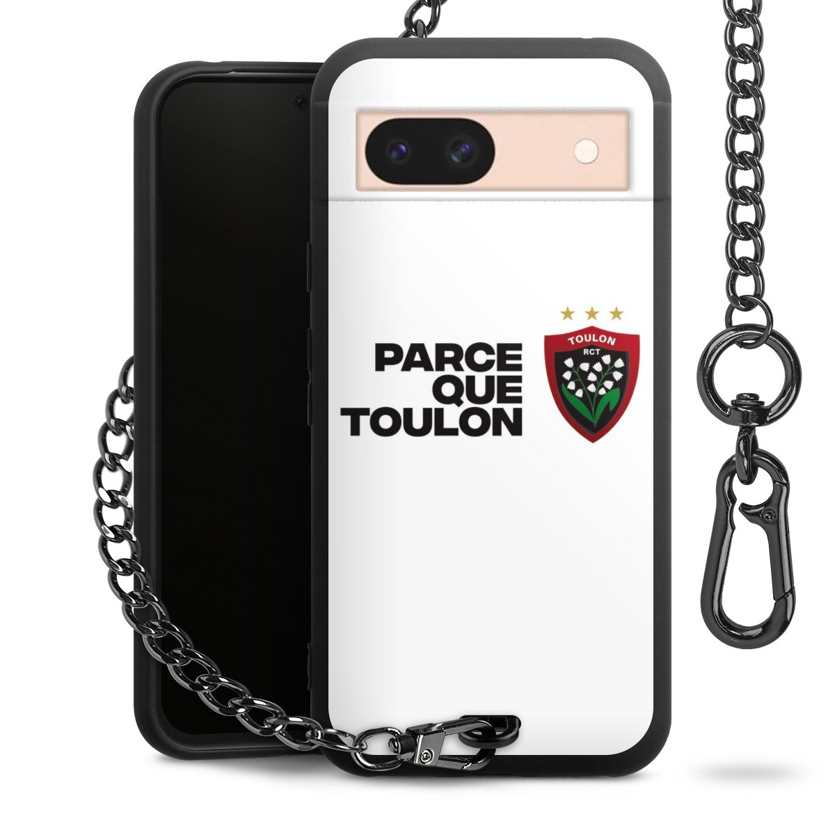 Die mattschwarze Silikon-Handyhülle besteht aus robustem TPU (thermoplastisches Polyurethan). Sie ist flexibel und schützt Dein Smartphone vor Stößen und Kratzern. Die Kette sowie der Karabinerhaken sind aus Metall in Gunmetal-Optik gefertigt. Für dieses Produkt kommen ausschließlich TÜV-geprüfte Materialien zum Einsatz.