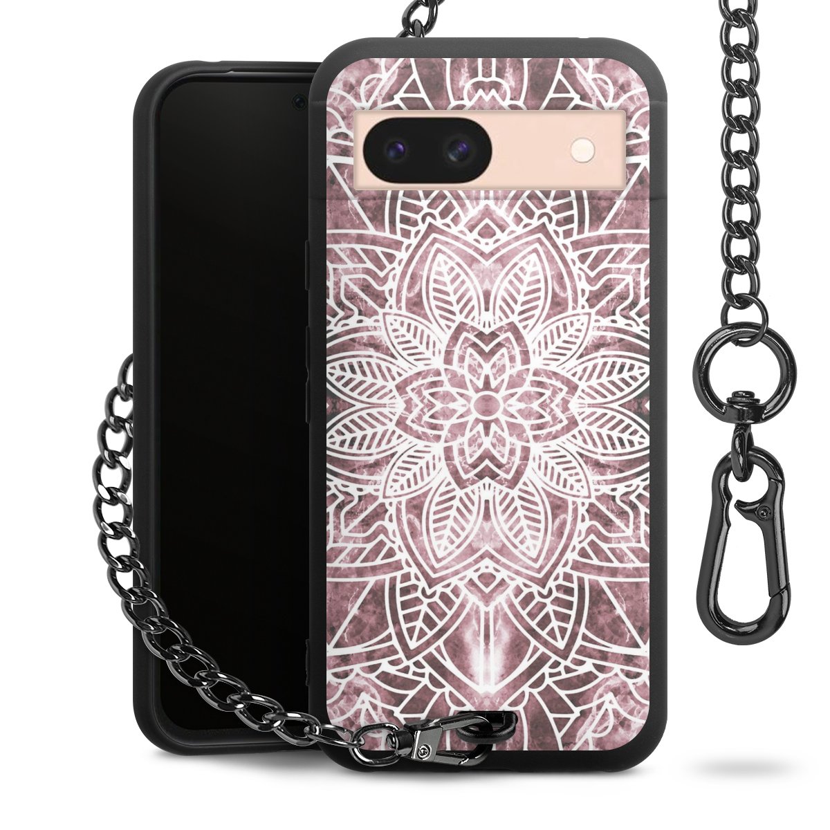 Die mattschwarze Silikon-Handyhülle besteht aus robustem TPU (thermoplastisches Polyurethan). Sie ist flexibel und schützt Dein Smartphone vor Stößen und Kratzern. Die Kette sowie der Karabinerhaken sind aus Metall in Gunmetal-Optik gefertigt. Für dieses Produkt kommen ausschließlich TÜV-geprüfte Materialien zum Einsatz.