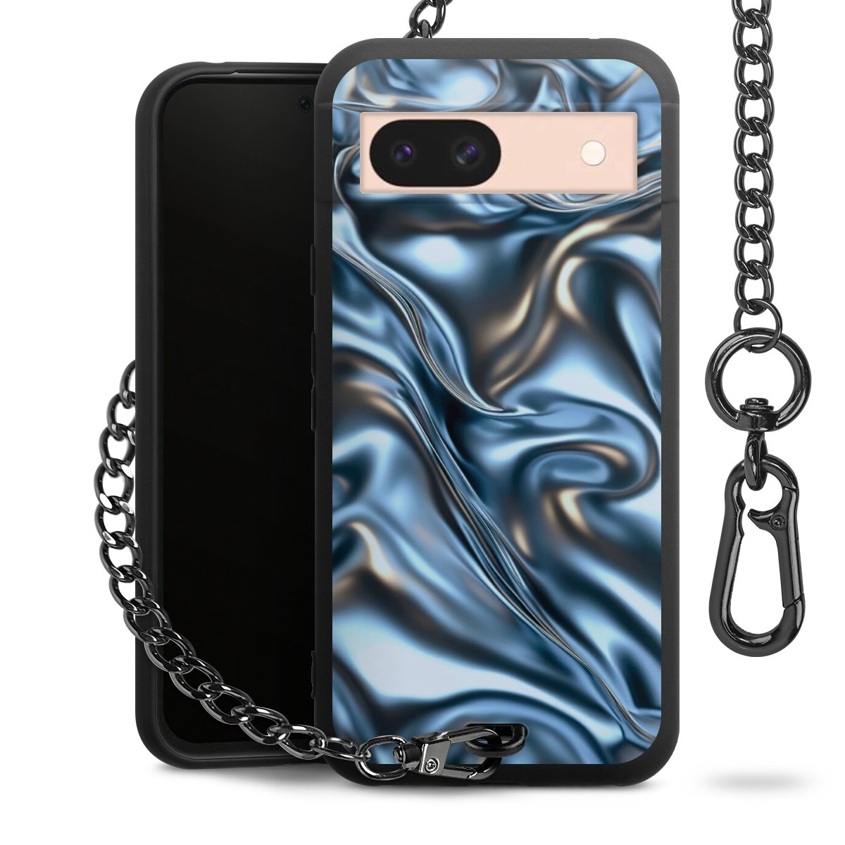 Die mattschwarze Silikon-Handyhülle besteht aus robustem TPU (thermoplastisches Polyurethan). Sie ist flexibel und schützt Dein Smartphone vor Stößen und Kratzern. Die Kette sowie der Karabinerhaken sind aus Metall in Gunmetal-Optik gefertigt. Für dieses Produkt kommen ausschließlich TÜV-geprüfte Materialien zum Einsatz.
