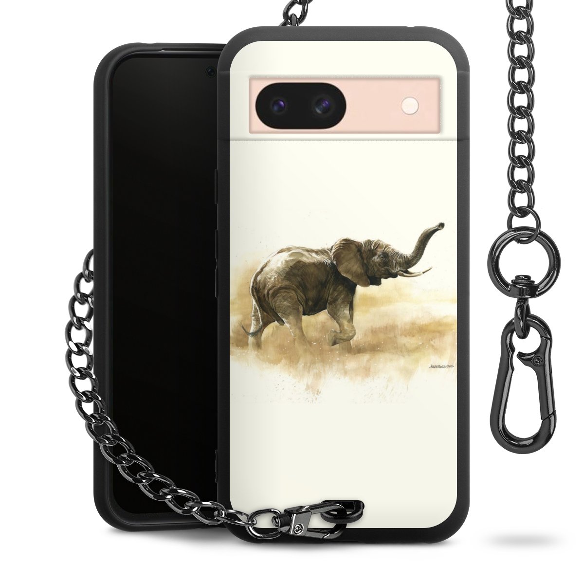 Die mattschwarze Silikon-Handyhülle besteht aus robustem TPU (thermoplastisches Polyurethan). Sie ist flexibel und schützt Dein Smartphone vor Stößen und Kratzern. Die Kette sowie der Karabinerhaken sind aus Metall in Gunmetal-Optik gefertigt. Für dieses Produkt kommen ausschließlich TÜV-geprüfte Materialien zum Einsatz.
