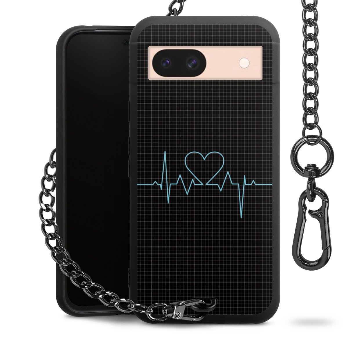 Die mattschwarze Silikon-Handyhülle besteht aus robustem TPU (thermoplastisches Polyurethan). Sie ist flexibel und schützt Dein Smartphone vor Stößen und Kratzern. Die Kette sowie der Karabinerhaken sind aus Metall in Gunmetal-Optik gefertigt. Für dieses Produkt kommen ausschließlich TÜV-geprüfte Materialien zum Einsatz.