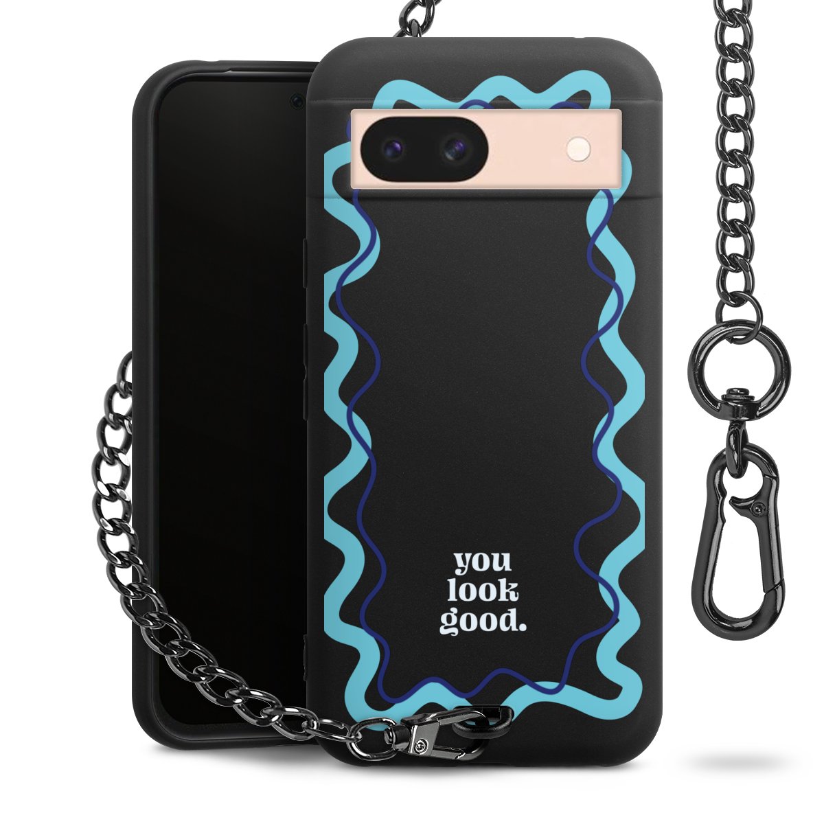 Die mattschwarze Silikon-Handyhülle besteht aus robustem TPU (thermoplastisches Polyurethan). Sie ist flexibel und schützt Dein Smartphone vor Stößen und Kratzern. Die Kette sowie der Karabinerhaken sind aus Metall in Gunmetal-Optik gefertigt. Für dieses Produkt kommen ausschließlich TÜV-geprüfte Materialien zum Einsatz.