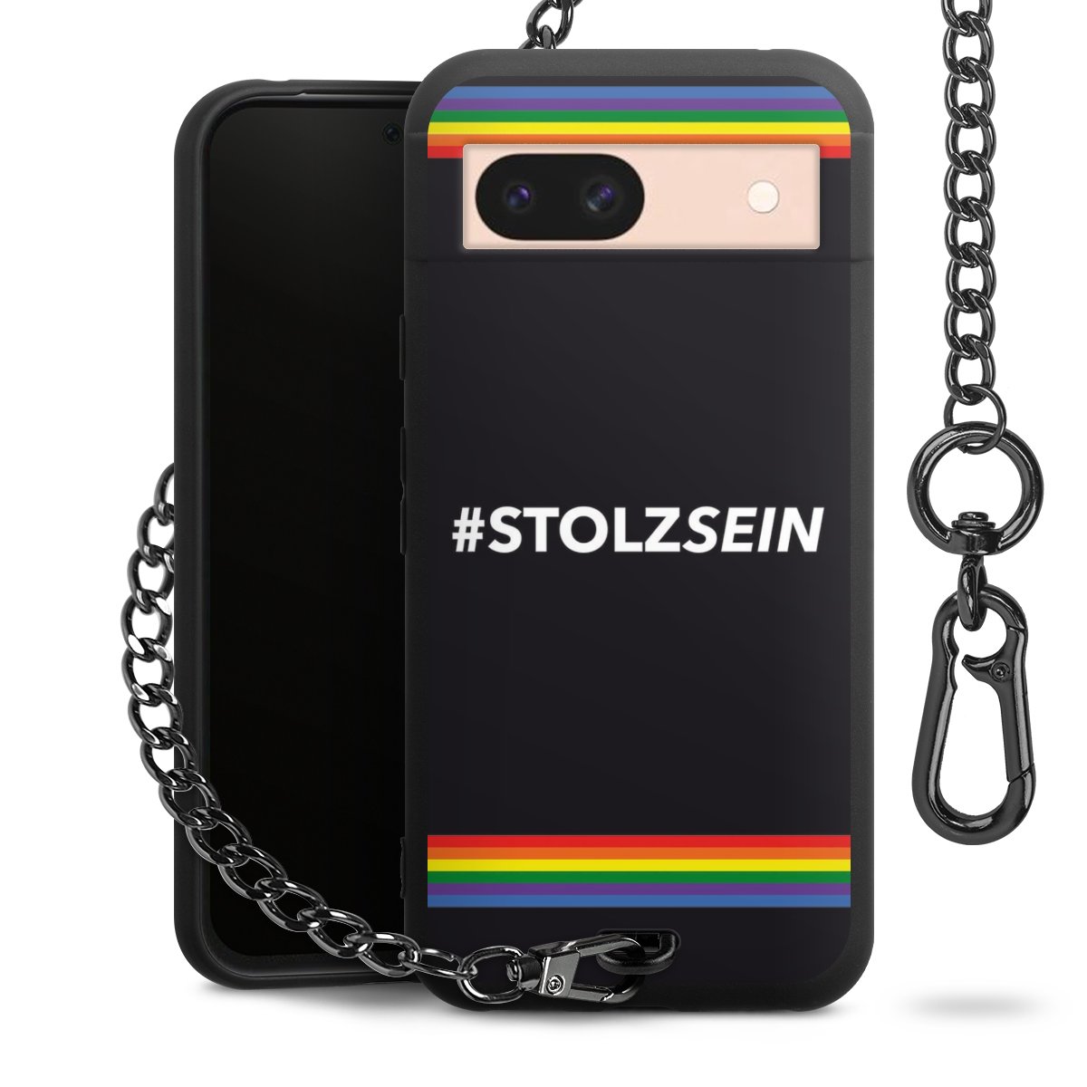 Die mattschwarze Silikon-Handyhülle besteht aus robustem TPU (thermoplastisches Polyurethan). Sie ist flexibel und schützt Dein Smartphone vor Stößen und Kratzern. Die Kette sowie der Karabinerhaken sind aus Metall in Gunmetal-Optik gefertigt. Für dieses Produkt kommen ausschließlich TÜV-geprüfte Materialien zum Einsatz.