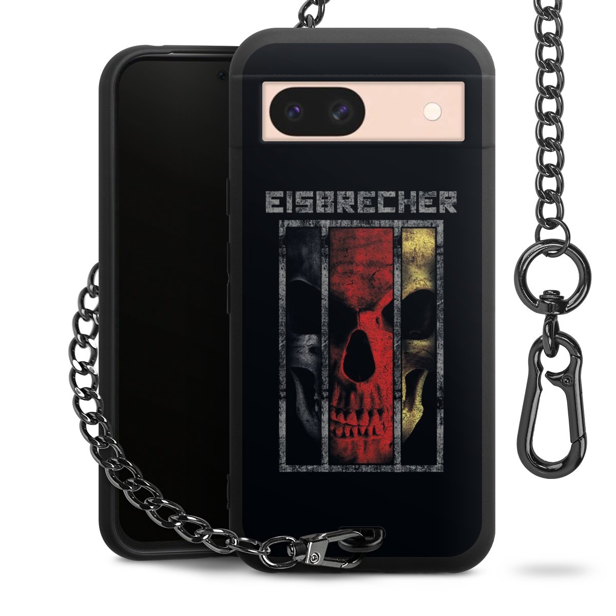 Die mattschwarze Silikon-Handyhülle besteht aus robustem TPU (thermoplastisches Polyurethan). Sie ist flexibel und schützt Dein Smartphone vor Stößen und Kratzern. Die Kette sowie der Karabinerhaken sind aus Metall in Gunmetal-Optik gefertigt. Für dieses Produkt kommen ausschließlich TÜV-geprüfte Materialien zum Einsatz.