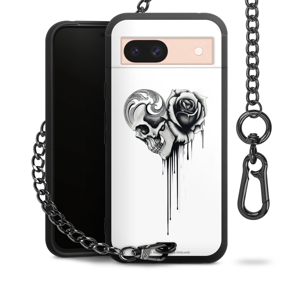 Die mattschwarze Silikon-Handyhülle besteht aus robustem TPU (thermoplastisches Polyurethan). Sie ist flexibel und schützt Dein Smartphone vor Stößen und Kratzern. Die Kette sowie der Karabinerhaken sind aus Metall in Gunmetal-Optik gefertigt. Für dieses Produkt kommen ausschließlich TÜV-geprüfte Materialien zum Einsatz.