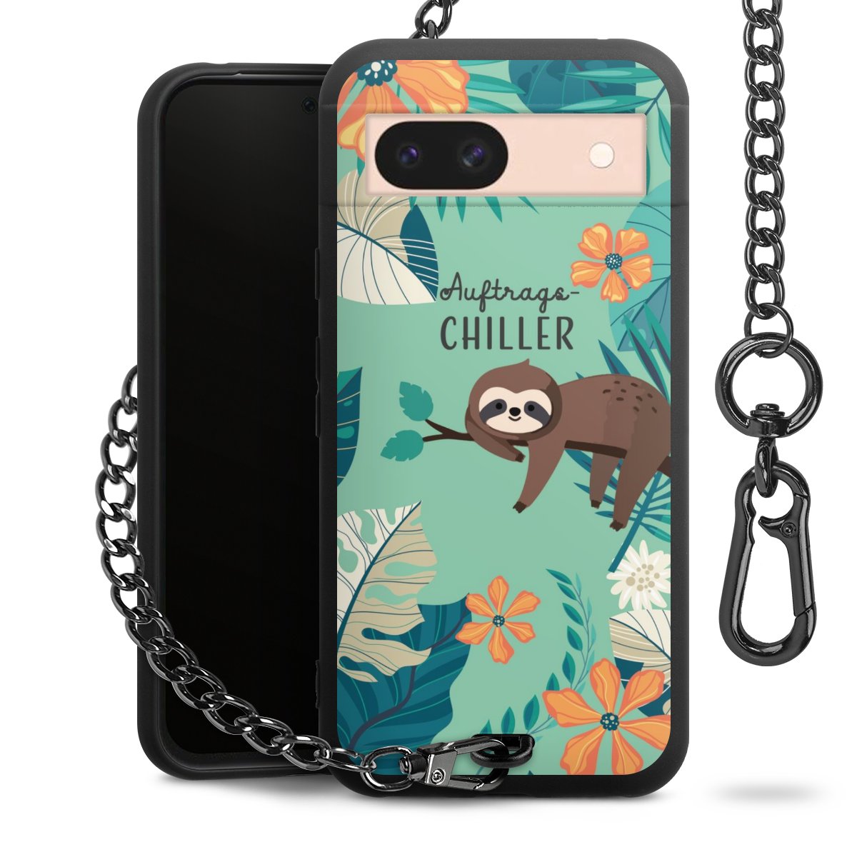 Die mattschwarze Silikon-Handyhülle besteht aus robustem TPU (thermoplastisches Polyurethan). Sie ist flexibel und schützt Dein Smartphone vor Stößen und Kratzern. Die Kette sowie der Karabinerhaken sind aus Metall in Gunmetal-Optik gefertigt. Für dieses Produkt kommen ausschließlich TÜV-geprüfte Materialien zum Einsatz.