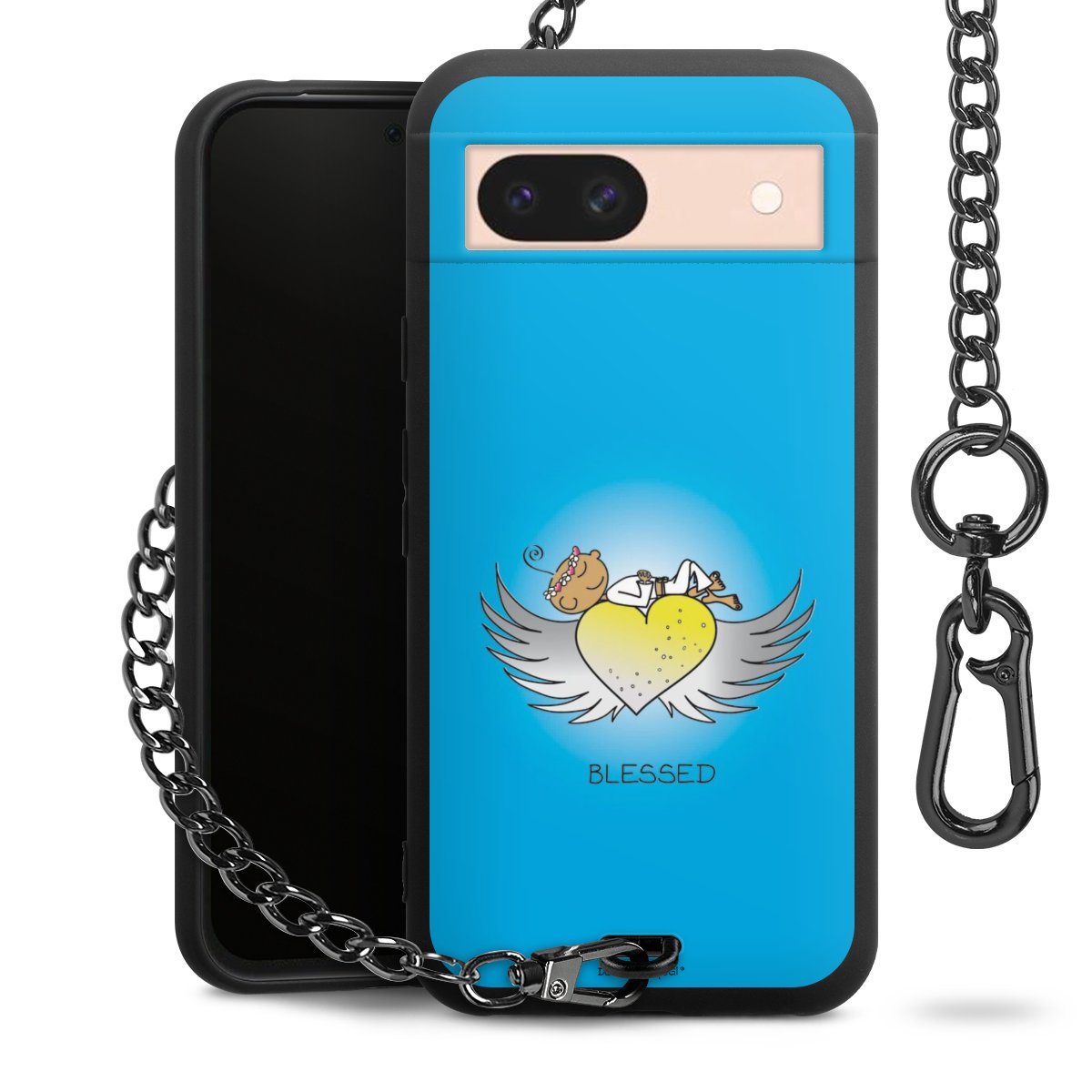 Die mattschwarze Silikon-Handyhülle besteht aus robustem TPU (thermoplastisches Polyurethan). Sie ist flexibel und schützt Dein Smartphone vor Stößen und Kratzern. Die Kette sowie der Karabinerhaken sind aus Metall in Gunmetal-Optik gefertigt. Für dieses Produkt kommen ausschließlich TÜV-geprüfte Materialien zum Einsatz.