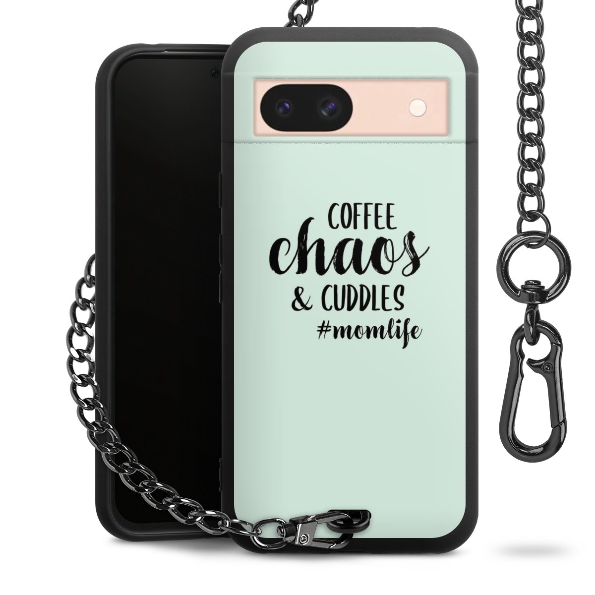 Die mattschwarze Silikon-Handyhülle besteht aus robustem TPU (thermoplastisches Polyurethan). Sie ist flexibel und schützt Dein Smartphone vor Stößen und Kratzern. Die Kette sowie der Karabinerhaken sind aus Metall in Gunmetal-Optik gefertigt. Für dieses Produkt kommen ausschließlich TÜV-geprüfte Materialien zum Einsatz.