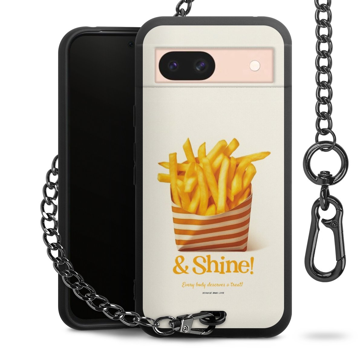 Die Handyhülle verfügt über eine mittig am unteren Rand platzierte Öse, an der die Metallkette stabil befestigt ist. Bestelle die Hülle einfach für Dein Smartphone-Modell, dann passt sie wie angegossen und Du brauchst sie bloß einmal anzudrücken. Handy in die Tasche, Karabiner an den Hosenbund – schon kann die Party starten.