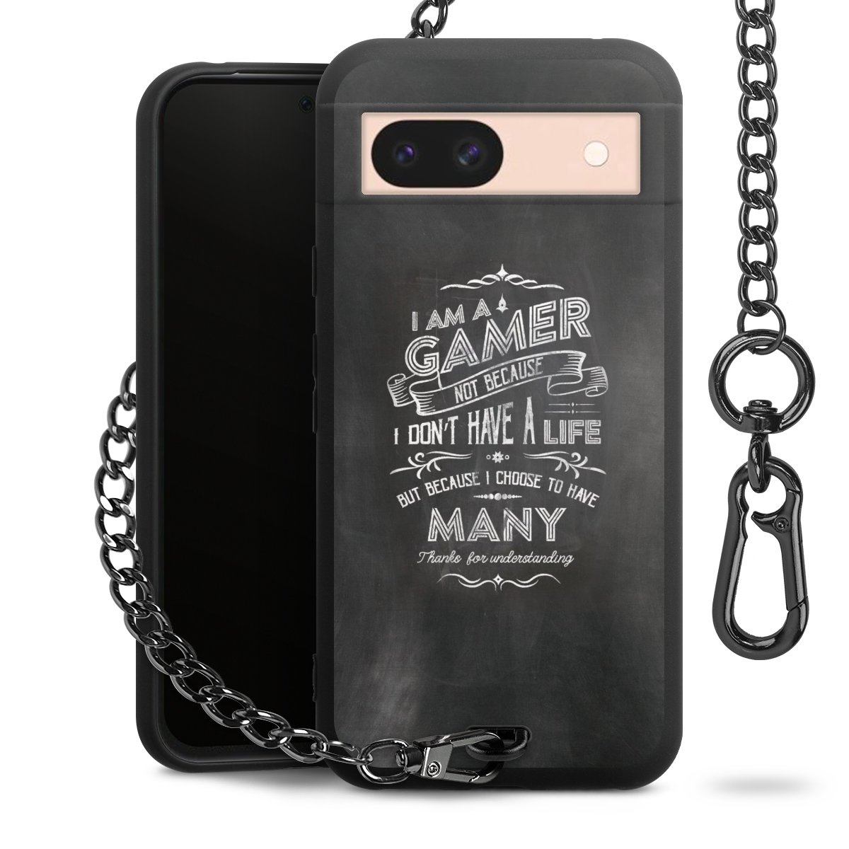 Die mattschwarze Silikon-Handyhülle besteht aus robustem TPU (thermoplastisches Polyurethan). Sie ist flexibel und schützt Dein Smartphone vor Stößen und Kratzern. Die Kette sowie der Karabinerhaken sind aus Metall in Gunmetal-Optik gefertigt. Für dieses Produkt kommen ausschließlich TÜV-geprüfte Materialien zum Einsatz.