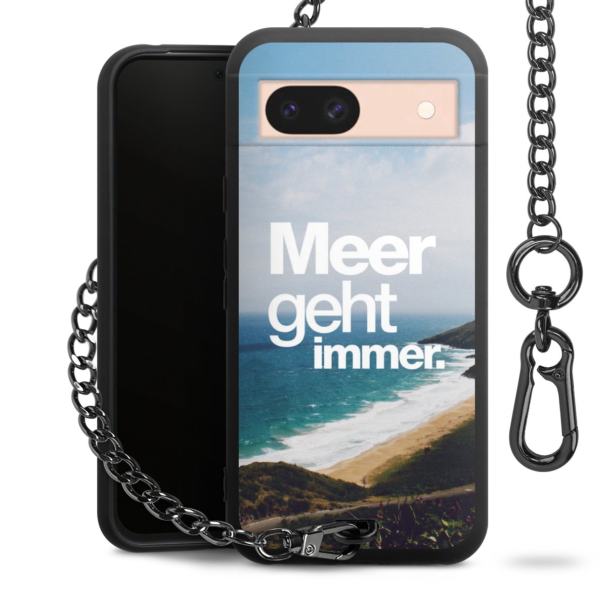 Die mattschwarze Silikon-Handyhülle besteht aus robustem TPU (thermoplastisches Polyurethan). Sie ist flexibel und schützt Dein Smartphone vor Stößen und Kratzern. Die Kette sowie der Karabinerhaken sind aus Metall in Gunmetal-Optik gefertigt. Für dieses Produkt kommen ausschließlich TÜV-geprüfte Materialien zum Einsatz.