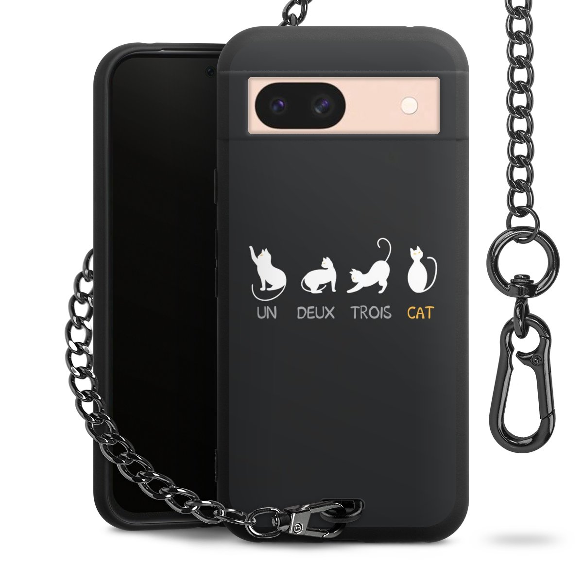 Die mattschwarze Silikon-Handyhülle besteht aus robustem TPU (thermoplastisches Polyurethan). Sie ist flexibel und schützt Dein Smartphone vor Stößen und Kratzern. Die Kette sowie der Karabinerhaken sind aus Metall in Gunmetal-Optik gefertigt. Für dieses Produkt kommen ausschließlich TÜV-geprüfte Materialien zum Einsatz.
