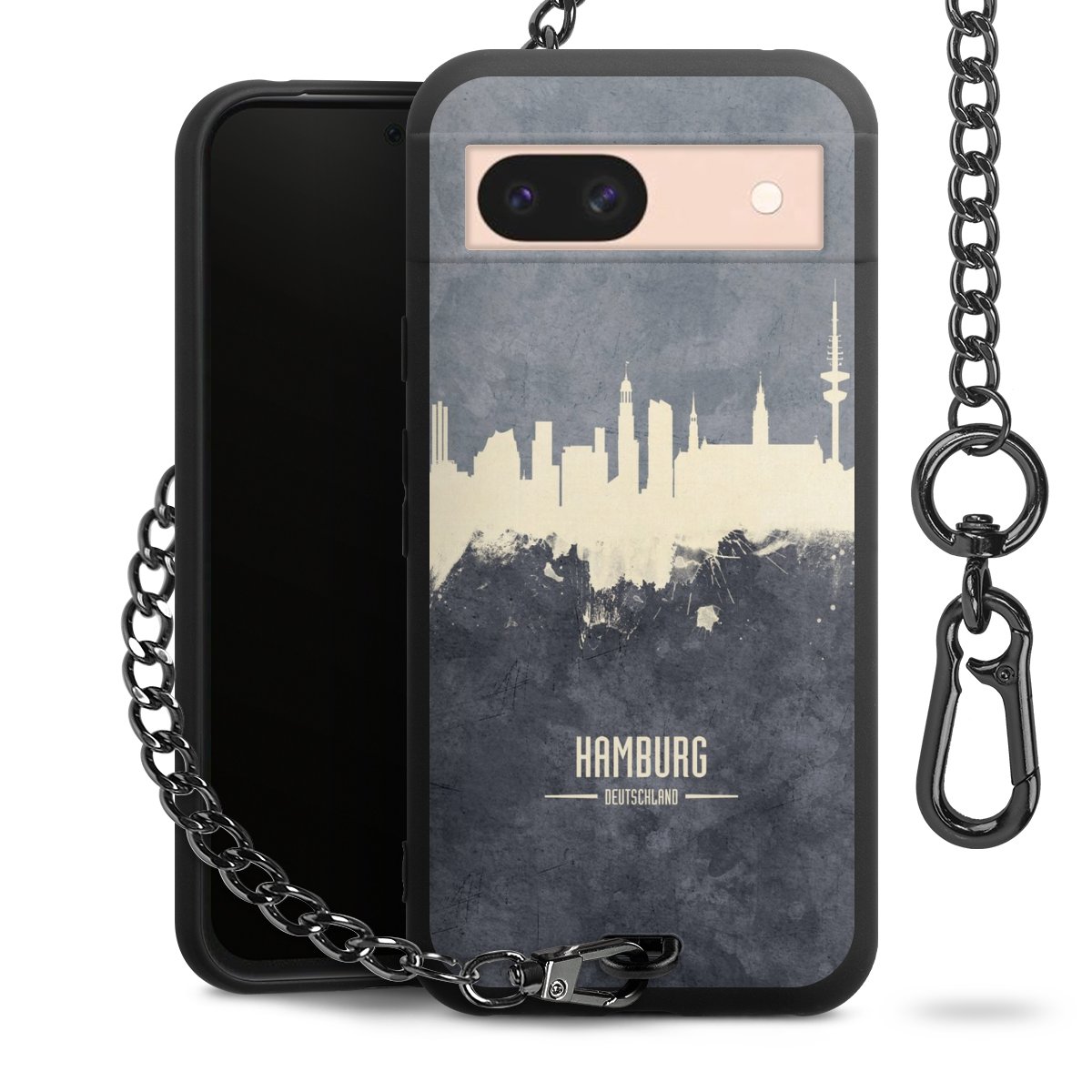Die mattschwarze Silikon-Handyhülle besteht aus robustem TPU (thermoplastisches Polyurethan). Sie ist flexibel und schützt Dein Smartphone vor Stößen und Kratzern. Die Kette sowie der Karabinerhaken sind aus Metall in Gunmetal-Optik gefertigt. Für dieses Produkt kommen ausschließlich TÜV-geprüfte Materialien zum Einsatz.