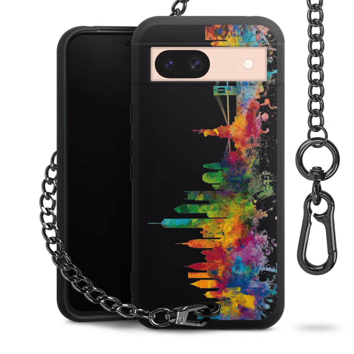 Die mattschwarze Silikon-Handyhülle besteht aus robustem TPU (thermoplastisches Polyurethan). Sie ist flexibel und schützt Dein Smartphone vor Stößen und Kratzern. Die Kette sowie der Karabinerhaken sind aus Metall in Gunmetal-Optik gefertigt. Für dieses Produkt kommen ausschließlich TÜV-geprüfte Materialien zum Einsatz.