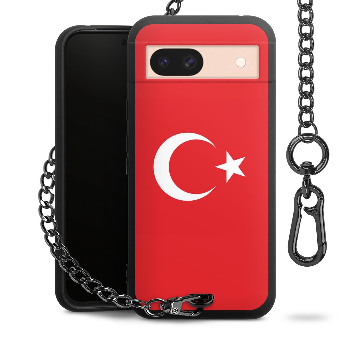 Die mattschwarze Silikon-Handyhülle besteht aus robustem TPU (thermoplastisches Polyurethan). Sie ist flexibel und schützt Dein Smartphone vor Stößen und Kratzern. Die Kette sowie der Karabinerhaken sind aus Metall in Gunmetal-Optik gefertigt. Für dieses Produkt kommen ausschließlich TÜV-geprüfte Materialien zum Einsatz.