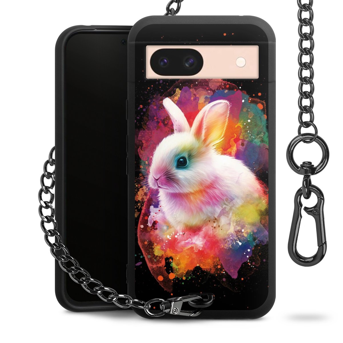Die Handyhülle verfügt über eine mittig am unteren Rand platzierte Öse, an der die Metallkette stabil befestigt ist. Bestelle die Hülle einfach für Dein Smartphone-Modell, dann passt sie wie angegossen und Du brauchst sie bloß einmal anzudrücken. Handy in die Tasche, Karabiner an den Hosenbund – schon kann die Party starten.