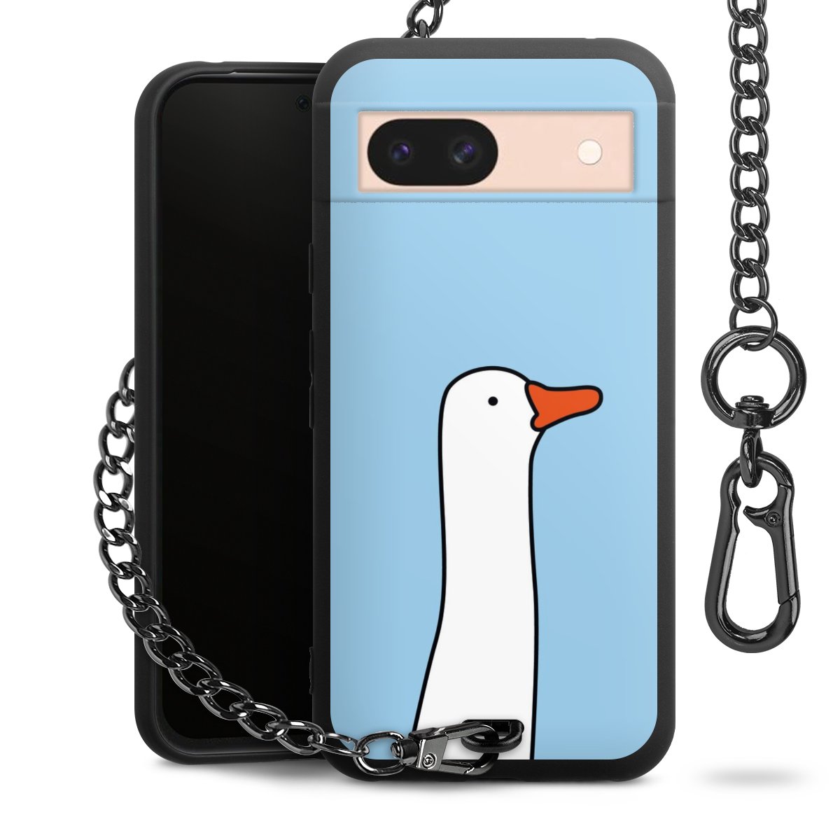 Die mattschwarze Silikon-Handyhülle besteht aus robustem TPU (thermoplastisches Polyurethan). Sie ist flexibel und schützt Dein Smartphone vor Stößen und Kratzern. Die Kette sowie der Karabinerhaken sind aus Metall in Gunmetal-Optik gefertigt. Für dieses Produkt kommen ausschließlich TÜV-geprüfte Materialien zum Einsatz.