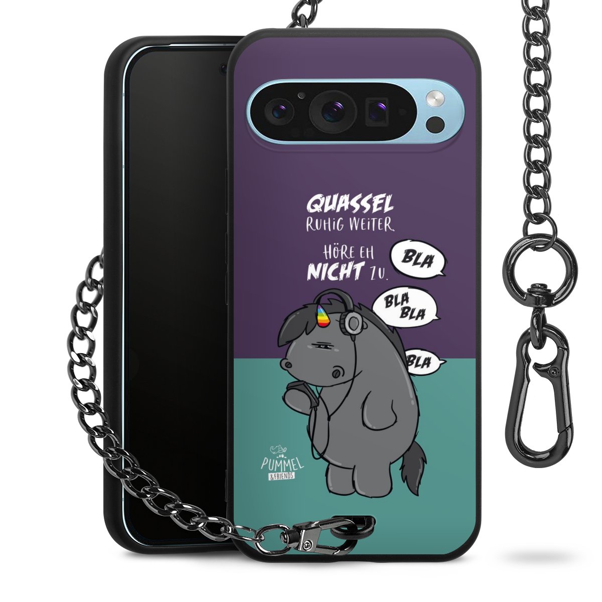Die mattschwarze Silikon-Handyhülle besteht aus robustem TPU (thermoplastisches Polyurethan). Sie ist flexibel und schützt Dein Smartphone vor Stößen und Kratzern. Die Kette sowie der Karabinerhaken sind aus Metall in Gunmetal-Optik gefertigt. Für dieses Produkt kommen ausschließlich TÜV-geprüfte Materialien zum Einsatz.