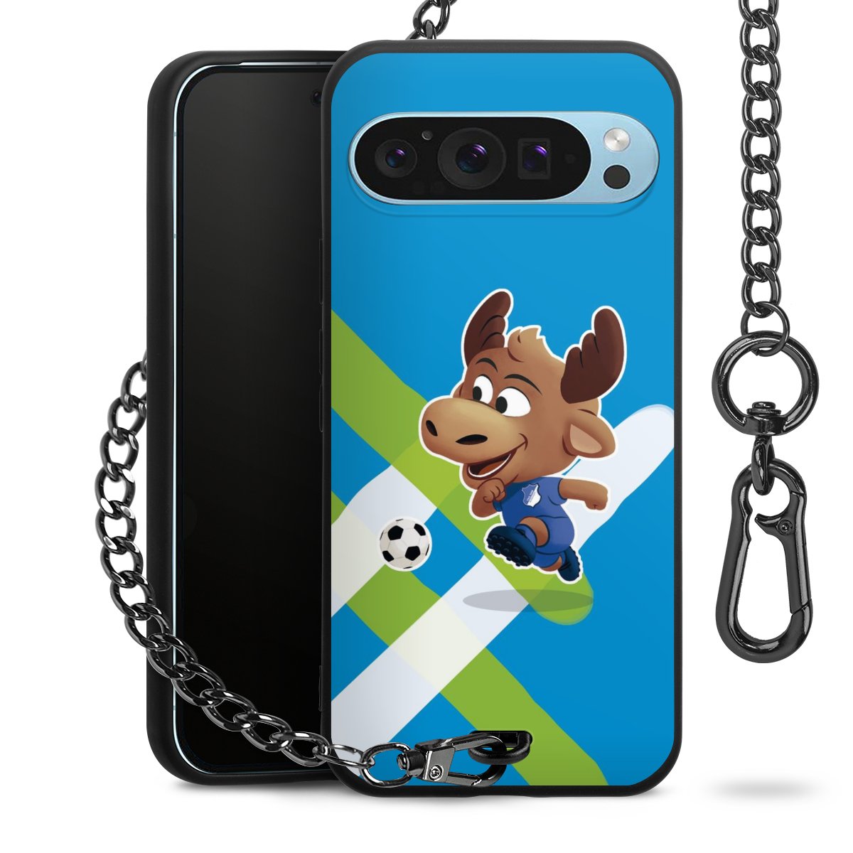 Die Handyhülle verfügt über eine mittig am unteren Rand platzierte Öse, an der die Metallkette stabil befestigt ist. Bestelle die Hülle einfach für Dein Smartphone-Modell, dann passt sie wie angegossen und Du brauchst sie bloß einmal anzudrücken. Handy in die Tasche, Karabiner an den Hosenbund – schon kann die Party starten.