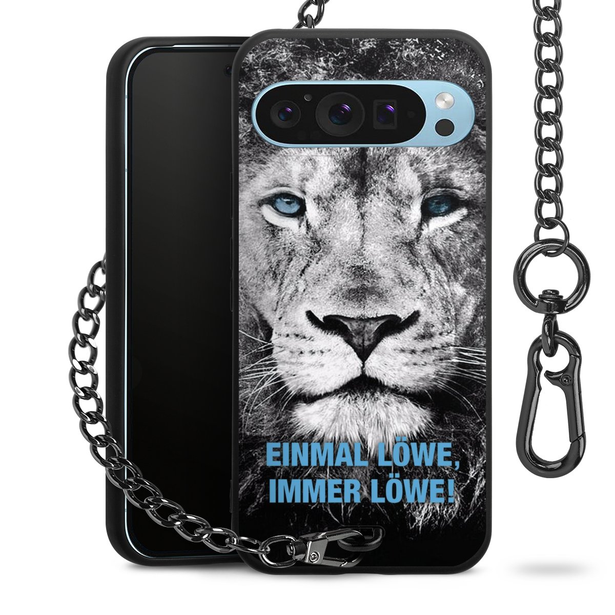 Die Handyhülle verfügt über eine mittig am unteren Rand platzierte Öse, an der die Metallkette stabil befestigt ist. Bestelle die Hülle einfach für Dein Smartphone-Modell, dann passt sie wie angegossen und Du brauchst sie bloß einmal anzudrücken. Handy in die Tasche, Karabiner an den Hosenbund – schon kann die Party starten.