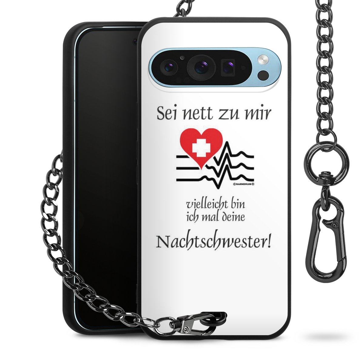 Die mattschwarze Silikon-Handyhülle besteht aus robustem TPU (thermoplastisches Polyurethan). Sie ist flexibel und schützt Dein Smartphone vor Stößen und Kratzern. Die Kette sowie der Karabinerhaken sind aus Metall in Gunmetal-Optik gefertigt. Für dieses Produkt kommen ausschließlich TÜV-geprüfte Materialien zum Einsatz.