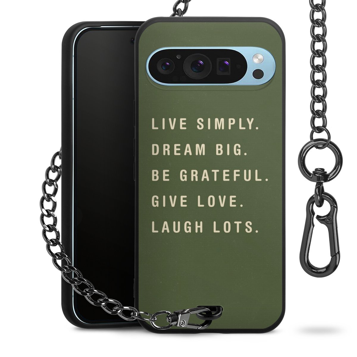 Die mattschwarze Silikon-Handyhülle besteht aus robustem TPU (thermoplastisches Polyurethan). Sie ist flexibel und schützt Dein Smartphone vor Stößen und Kratzern. Die Kette sowie der Karabinerhaken sind aus Metall in Gunmetal-Optik gefertigt. Für dieses Produkt kommen ausschließlich TÜV-geprüfte Materialien zum Einsatz.