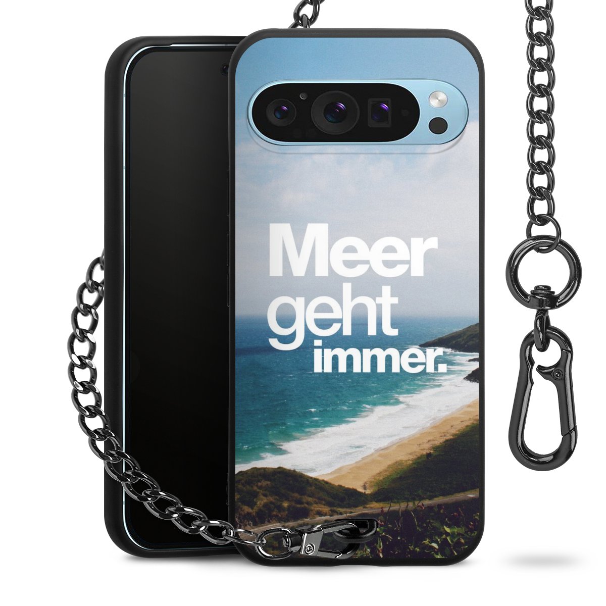 Die mattschwarze Silikon-Handyhülle besteht aus robustem TPU (thermoplastisches Polyurethan). Sie ist flexibel und schützt Dein Smartphone vor Stößen und Kratzern. Die Kette sowie der Karabinerhaken sind aus Metall in Gunmetal-Optik gefertigt. Für dieses Produkt kommen ausschließlich TÜV-geprüfte Materialien zum Einsatz.