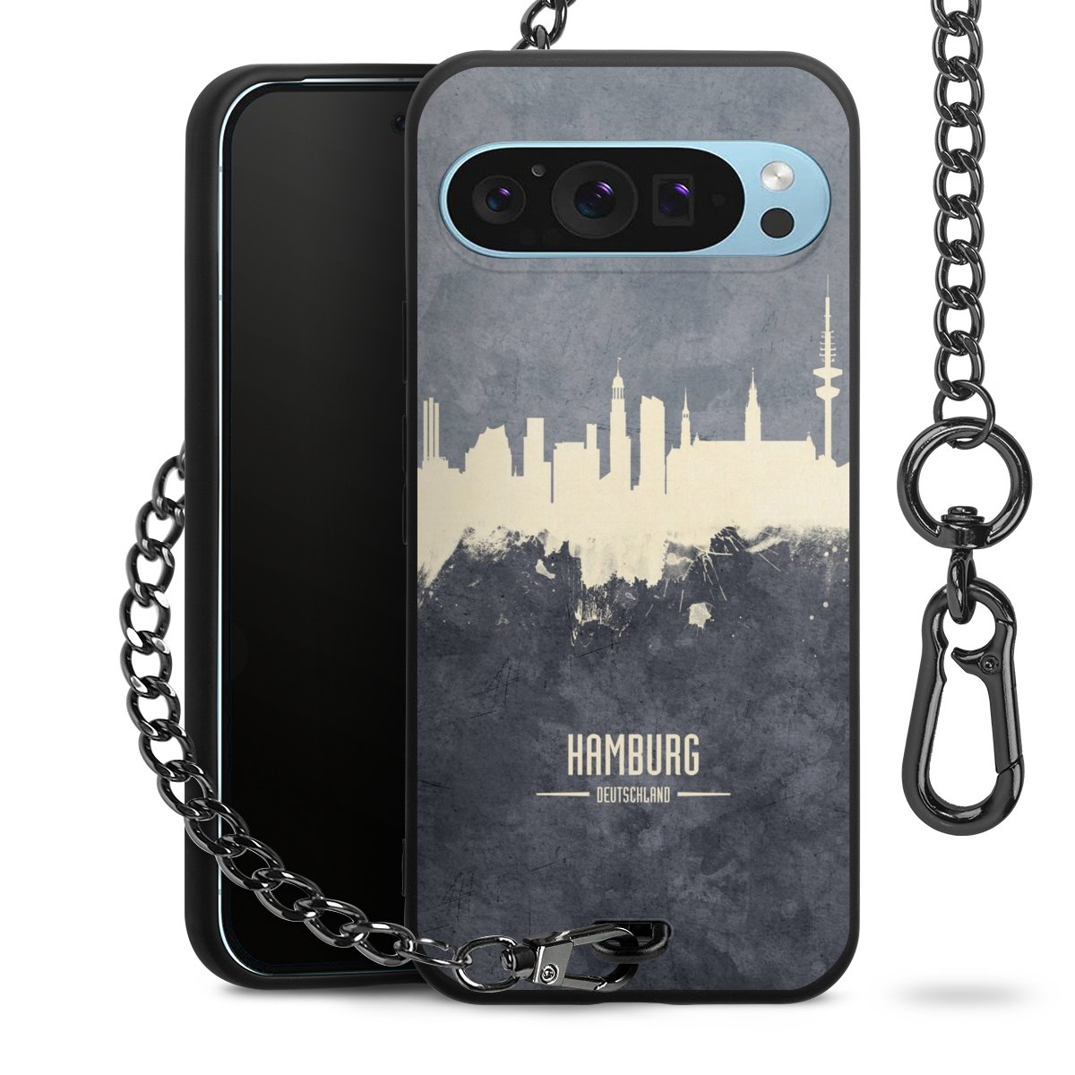 Die mattschwarze Silikon-Handyhülle besteht aus robustem TPU (thermoplastisches Polyurethan). Sie ist flexibel und schützt Dein Smartphone vor Stößen und Kratzern. Die Kette sowie der Karabinerhaken sind aus Metall in Gunmetal-Optik gefertigt. Für dieses Produkt kommen ausschließlich TÜV-geprüfte Materialien zum Einsatz.