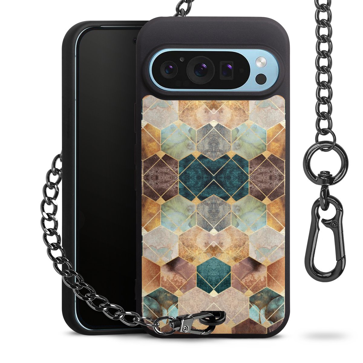 Die mattschwarze Silikon-Handyhülle besteht aus robustem TPU (thermoplastisches Polyurethan). Sie ist flexibel und schützt Dein Smartphone vor Stößen und Kratzern. Die Kette sowie der Karabinerhaken sind aus Metall in Gunmetal-Optik gefertigt. Für dieses Produkt kommen ausschließlich TÜV-geprüfte Materialien zum Einsatz.
