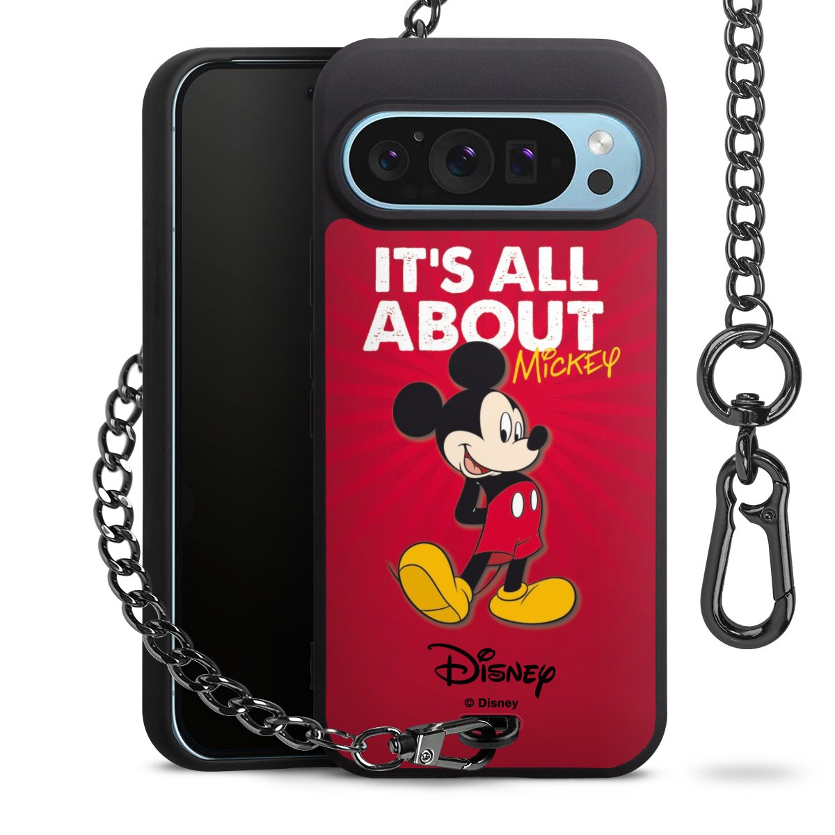 Die Handyhülle verfügt über eine mittig am unteren Rand platzierte Öse, an der die Metallkette stabil befestigt ist. Bestelle die Hülle einfach für Dein Smartphone-Modell, dann passt sie wie angegossen und Du brauchst sie bloß einmal anzudrücken. Handy in die Tasche, Karabiner an den Hosenbund – schon kann die Party starten.