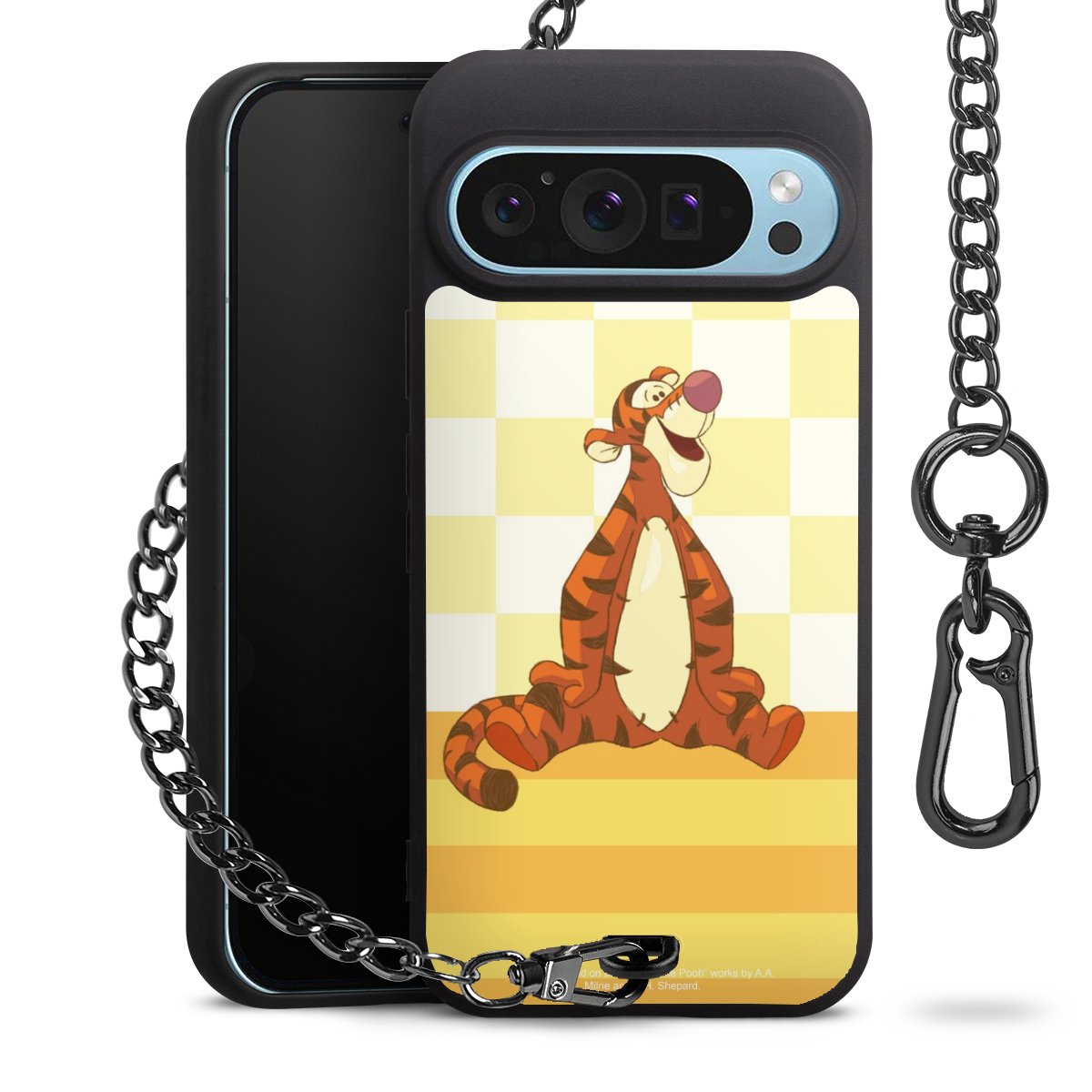 Die mattschwarze Silikon-Handyhülle besteht aus robustem TPU (thermoplastisches Polyurethan). Sie ist flexibel und schützt Dein Smartphone vor Stößen und Kratzern. Die Kette sowie der Karabinerhaken sind aus Metall in Gunmetal-Optik gefertigt. Für dieses Produkt kommen ausschließlich TÜV-geprüfte Materialien zum Einsatz.