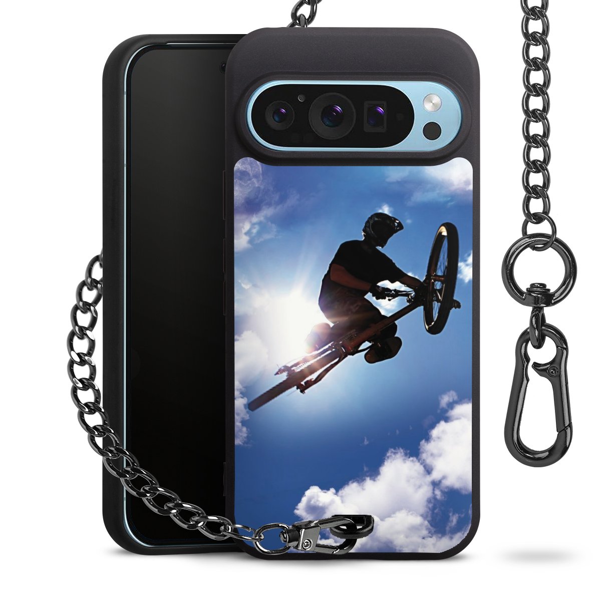 Die mattschwarze Silikon-Handyhülle besteht aus robustem TPU (thermoplastisches Polyurethan). Sie ist flexibel und schützt Dein Smartphone vor Stößen und Kratzern. Die Kette sowie der Karabinerhaken sind aus Metall in Gunmetal-Optik gefertigt. Für dieses Produkt kommen ausschließlich TÜV-geprüfte Materialien zum Einsatz.
