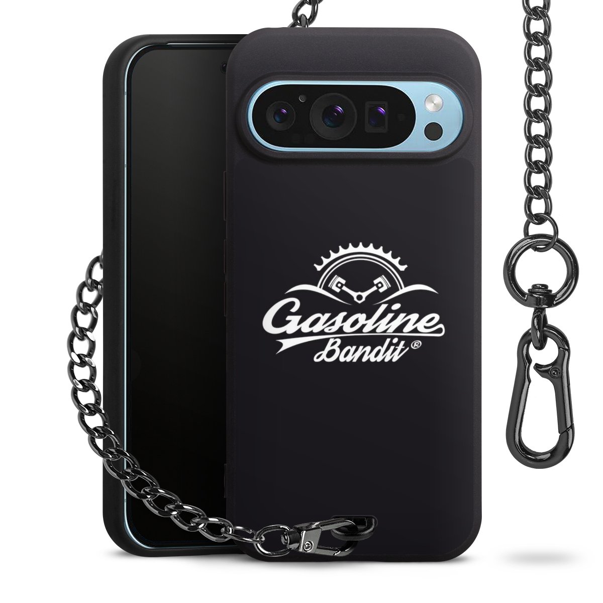 Die mattschwarze Silikon-Handyhülle besteht aus robustem TPU (thermoplastisches Polyurethan). Sie ist flexibel und schützt Dein Smartphone vor Stößen und Kratzern. Die Kette sowie der Karabinerhaken sind aus Metall in Gunmetal-Optik gefertigt. Für dieses Produkt kommen ausschließlich TÜV-geprüfte Materialien zum Einsatz.