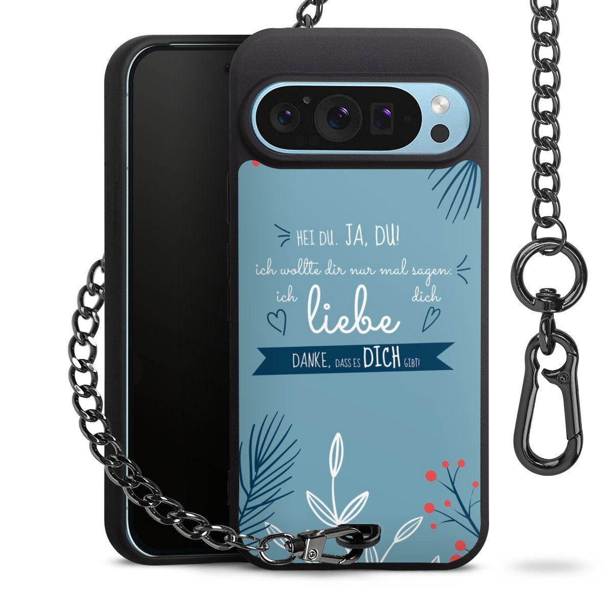 Die mattschwarze Silikon-Handyhülle besteht aus robustem TPU (thermoplastisches Polyurethan). Sie ist flexibel und schützt Dein Smartphone vor Stößen und Kratzern. Die Kette sowie der Karabinerhaken sind aus Metall in Gunmetal-Optik gefertigt. Für dieses Produkt kommen ausschließlich TÜV-geprüfte Materialien zum Einsatz.