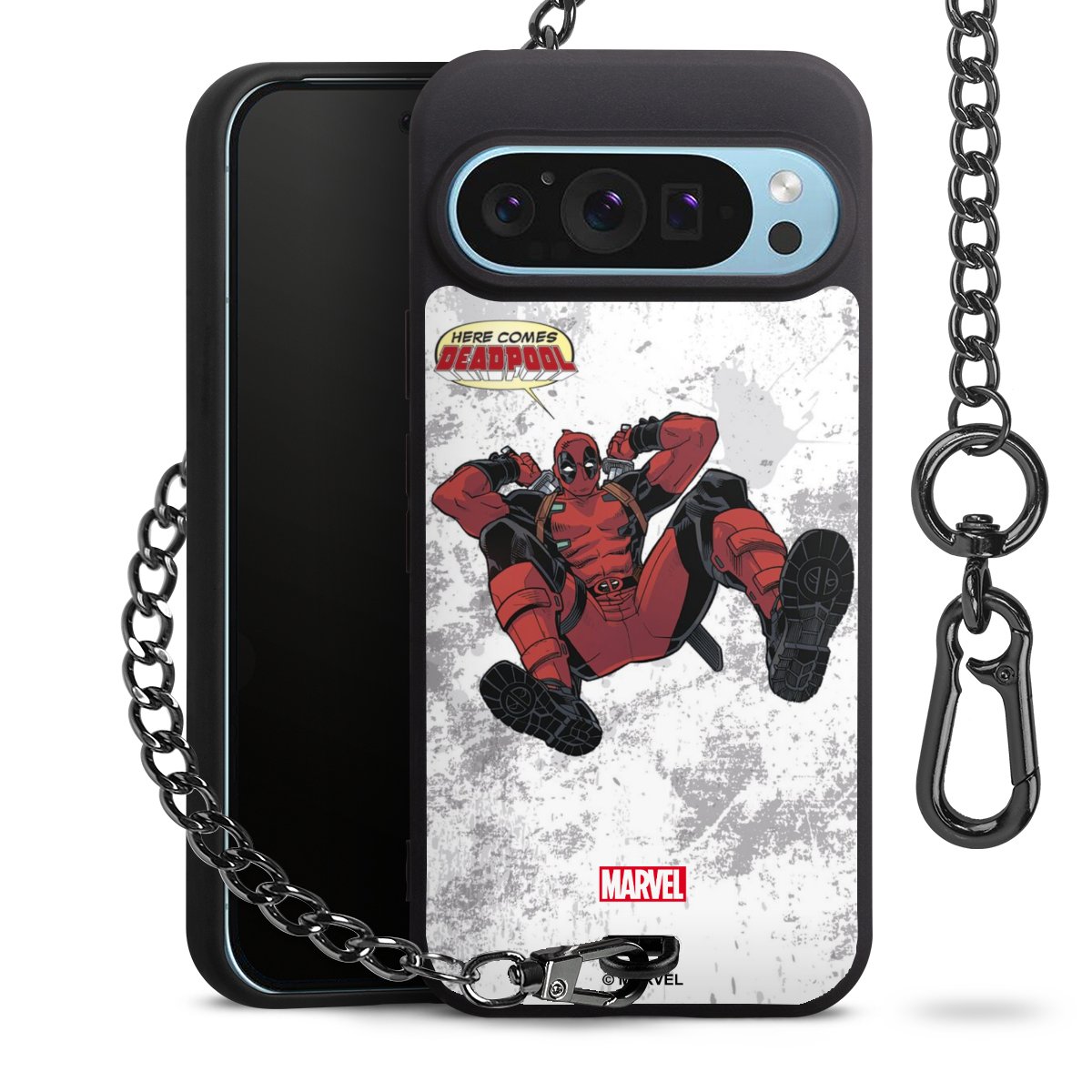 Die mattschwarze Silikon-Handyhülle besteht aus robustem TPU (thermoplastisches Polyurethan). Sie ist flexibel und schützt Dein Smartphone vor Stößen und Kratzern. Die Kette sowie der Karabinerhaken sind aus Metall in Gunmetal-Optik gefertigt. Für dieses Produkt kommen ausschließlich TÜV-geprüfte Materialien zum Einsatz.