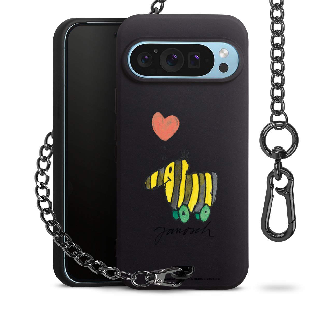 Die mattschwarze Silikon-Handyhülle besteht aus robustem TPU (thermoplastisches Polyurethan). Sie ist flexibel und schützt Dein Smartphone vor Stößen und Kratzern. Die Kette sowie der Karabinerhaken sind aus Metall in Gunmetal-Optik gefertigt. Für dieses Produkt kommen ausschließlich TÜV-geprüfte Materialien zum Einsatz.