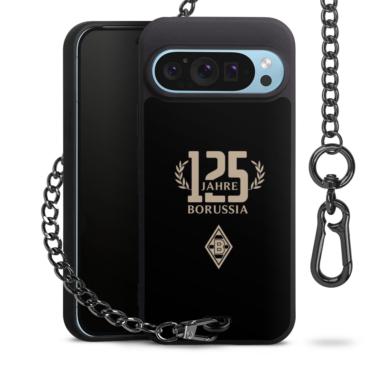 Die mattschwarze Silikon-Handyhülle besteht aus robustem TPU (thermoplastisches Polyurethan). Sie ist flexibel und schützt Dein Smartphone vor Stößen und Kratzern. Die Kette sowie der Karabinerhaken sind aus Metall in Gunmetal-Optik gefertigt. Für dieses Produkt kommen ausschließlich TÜV-geprüfte Materialien zum Einsatz.