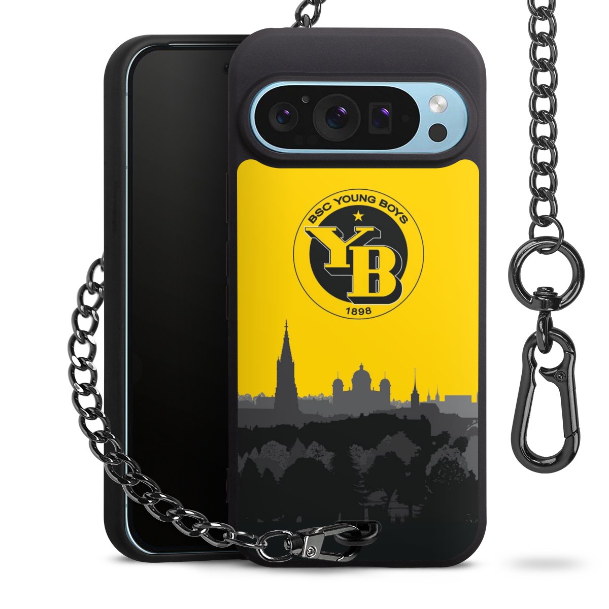 Die mattschwarze Silikon-Handyhülle besteht aus robustem TPU (thermoplastisches Polyurethan). Sie ist flexibel und schützt Dein Smartphone vor Stößen und Kratzern. Die Kette sowie der Karabinerhaken sind aus Metall in Gunmetal-Optik gefertigt. Für dieses Produkt kommen ausschließlich TÜV-geprüfte Materialien zum Einsatz.