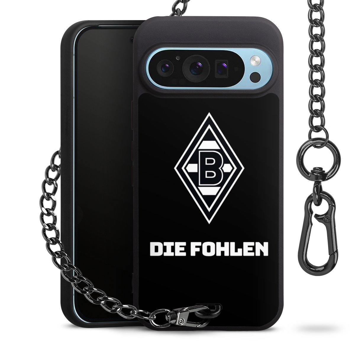 Die mattschwarze Silikon-Handyhülle besteht aus robustem TPU (thermoplastisches Polyurethan). Sie ist flexibel und schützt Dein Smartphone vor Stößen und Kratzern. Die Kette sowie der Karabinerhaken sind aus Metall in Gunmetal-Optik gefertigt. Für dieses Produkt kommen ausschließlich TÜV-geprüfte Materialien zum Einsatz.