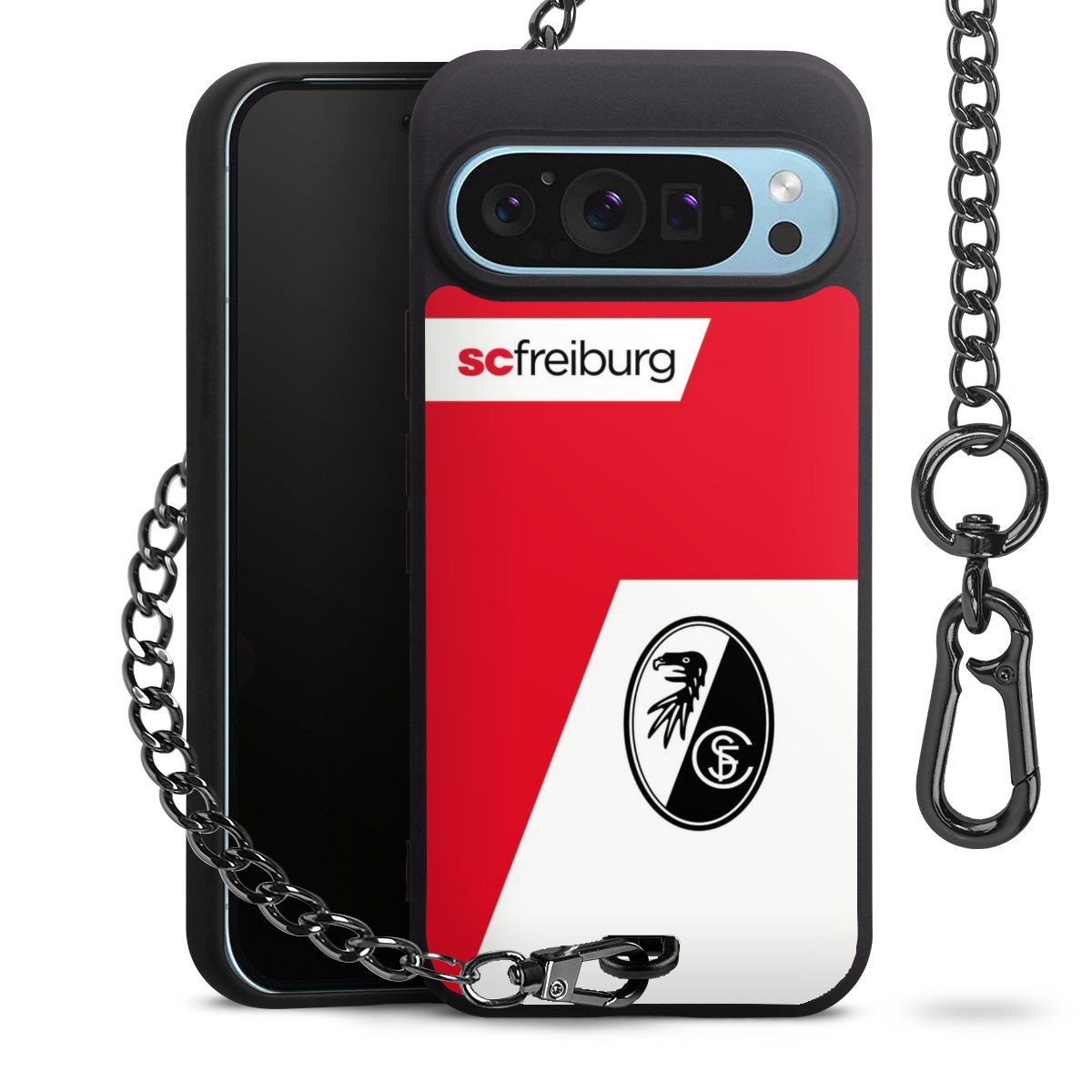 Die mattschwarze Silikon-Handyhülle besteht aus robustem TPU (thermoplastisches Polyurethan). Sie ist flexibel und schützt Dein Smartphone vor Stößen und Kratzern. Die Kette sowie der Karabinerhaken sind aus Metall in Gunmetal-Optik gefertigt. Für dieses Produkt kommen ausschließlich TÜV-geprüfte Materialien zum Einsatz.