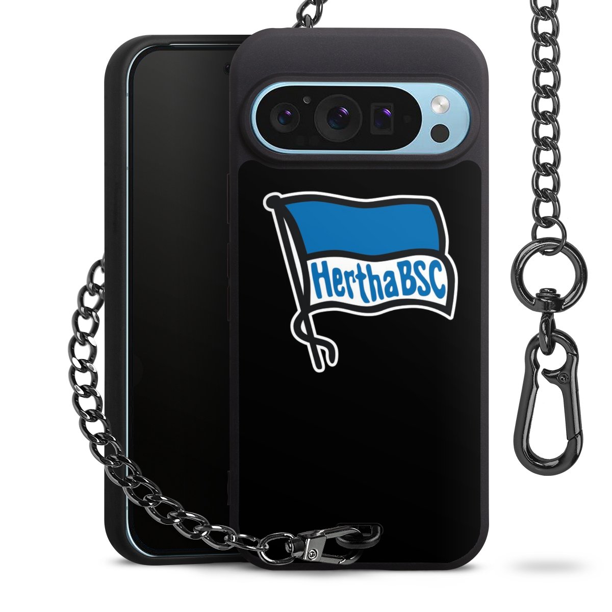 Die mattschwarze Silikon-Handyhülle besteht aus robustem TPU (thermoplastisches Polyurethan). Sie ist flexibel und schützt Dein Smartphone vor Stößen und Kratzern. Die Kette sowie der Karabinerhaken sind aus Metall in Gunmetal-Optik gefertigt. Für dieses Produkt kommen ausschließlich TÜV-geprüfte Materialien zum Einsatz.