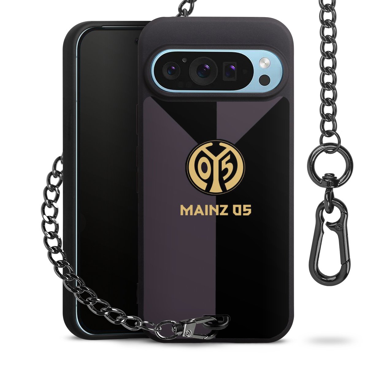 Die mattschwarze Silikon-Handyhülle besteht aus robustem TPU (thermoplastisches Polyurethan). Sie ist flexibel und schützt Dein Smartphone vor Stößen und Kratzern. Die Kette sowie der Karabinerhaken sind aus Metall in Gunmetal-Optik gefertigt. Für dieses Produkt kommen ausschließlich TÜV-geprüfte Materialien zum Einsatz.