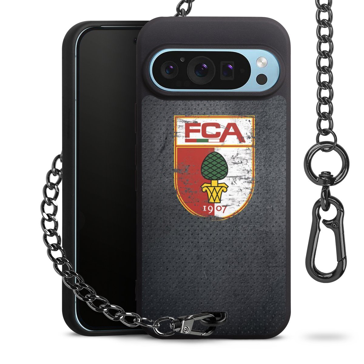 Die mattschwarze Silikon-Handyhülle besteht aus robustem TPU (thermoplastisches Polyurethan). Sie ist flexibel und schützt Dein Smartphone vor Stößen und Kratzern. Die Kette sowie der Karabinerhaken sind aus Metall in Gunmetal-Optik gefertigt. Für dieses Produkt kommen ausschließlich TÜV-geprüfte Materialien zum Einsatz.