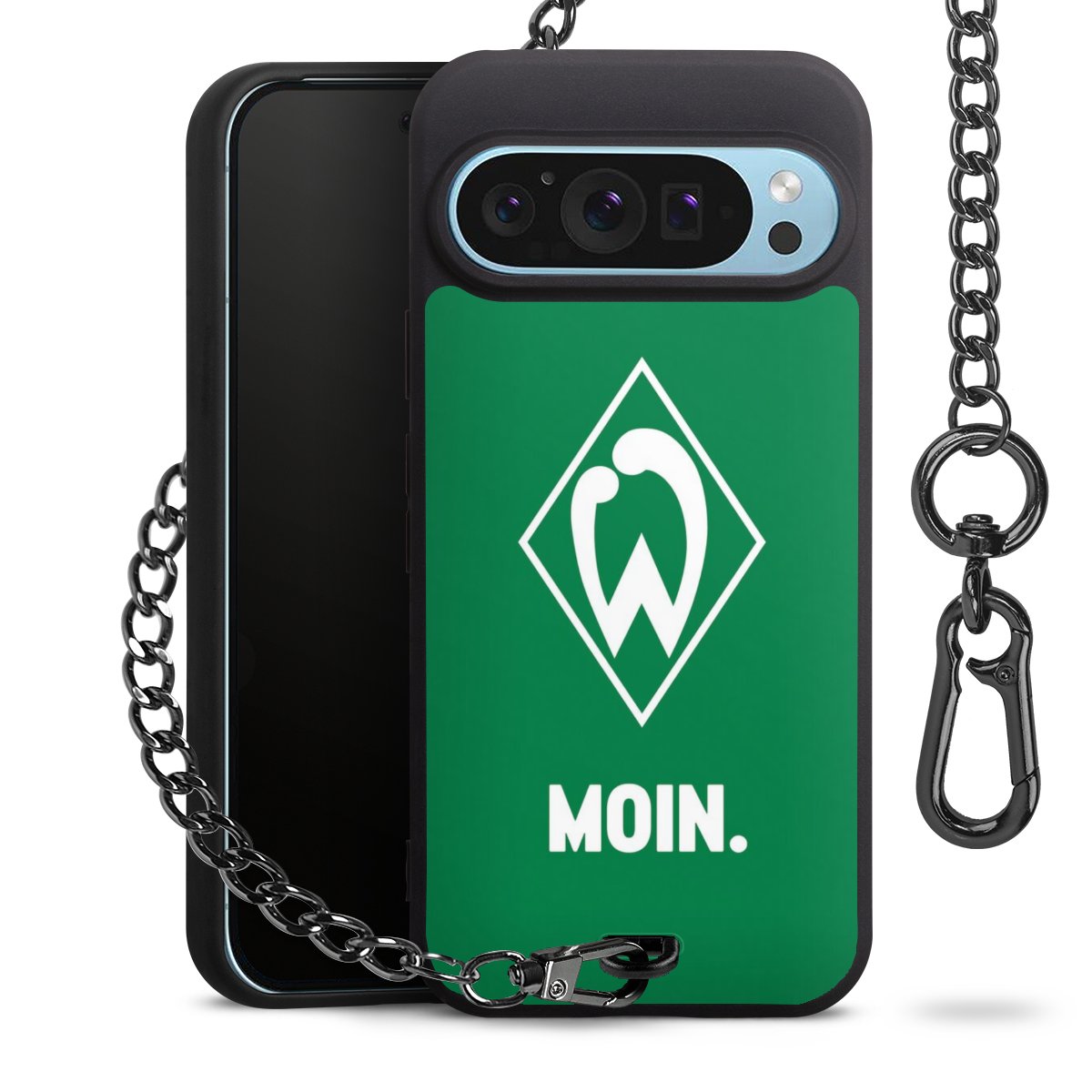 Die mattschwarze Silikon-Handyhülle besteht aus robustem TPU (thermoplastisches Polyurethan). Sie ist flexibel und schützt Dein Smartphone vor Stößen und Kratzern. Die Kette sowie der Karabinerhaken sind aus Metall in Gunmetal-Optik gefertigt. Für dieses Produkt kommen ausschließlich TÜV-geprüfte Materialien zum Einsatz.