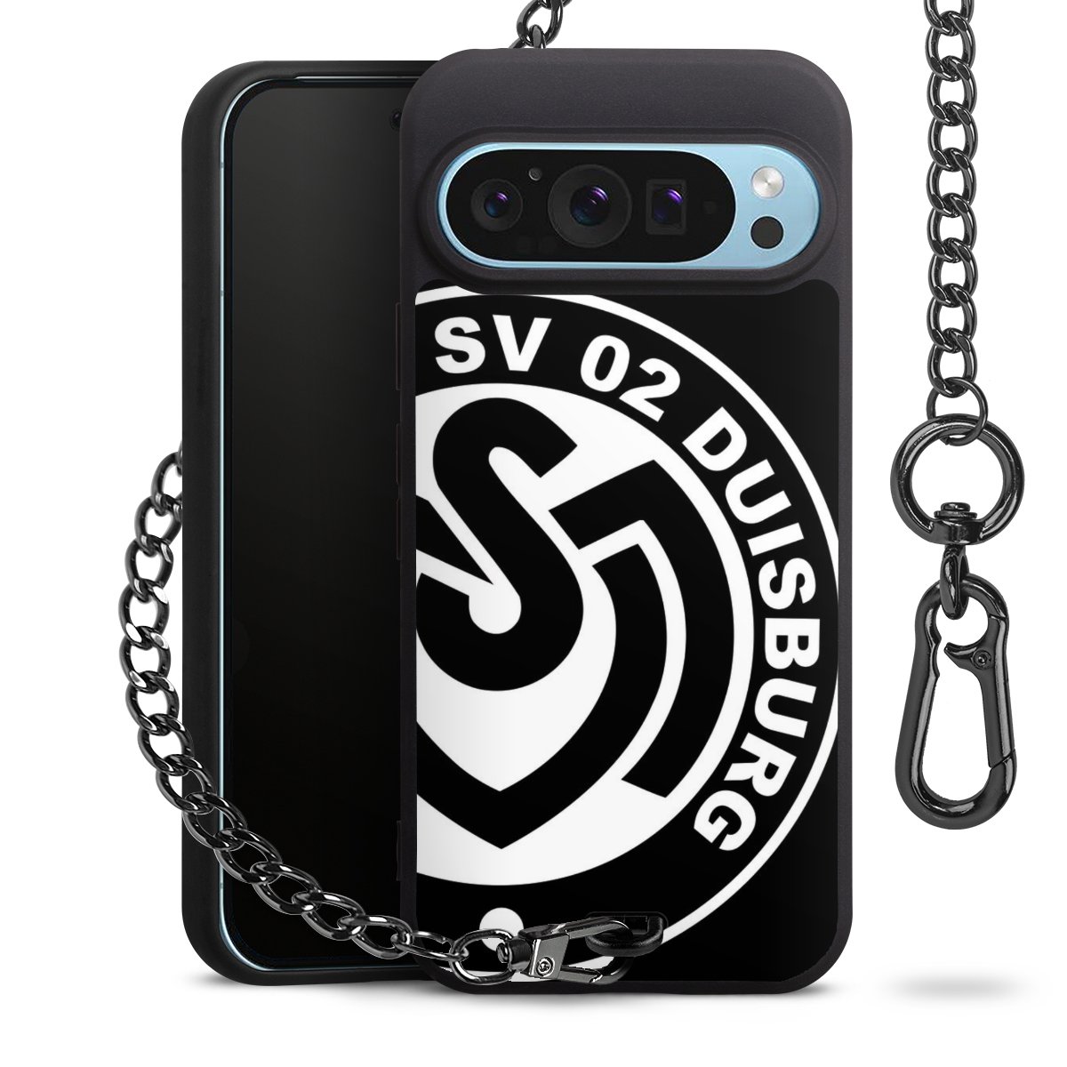 Die mattschwarze Silikon-Handyhülle besteht aus robustem TPU (thermoplastisches Polyurethan). Sie ist flexibel und schützt Dein Smartphone vor Stößen und Kratzern. Die Kette sowie der Karabinerhaken sind aus Metall in Gunmetal-Optik gefertigt. Für dieses Produkt kommen ausschließlich TÜV-geprüfte Materialien zum Einsatz.