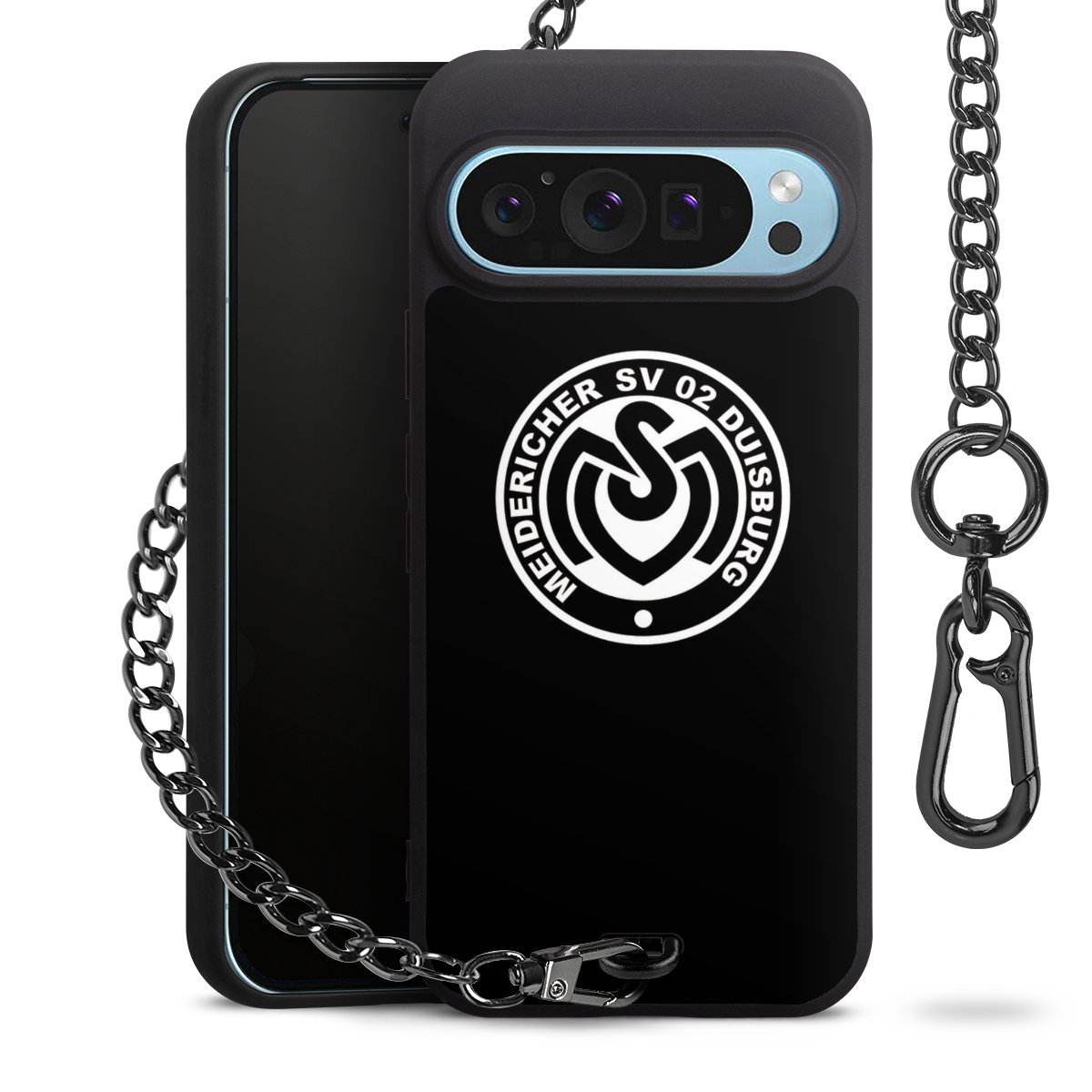 Die mattschwarze Silikon-Handyhülle besteht aus robustem TPU (thermoplastisches Polyurethan). Sie ist flexibel und schützt Dein Smartphone vor Stößen und Kratzern. Die Kette sowie der Karabinerhaken sind aus Metall in Gunmetal-Optik gefertigt. Für dieses Produkt kommen ausschließlich TÜV-geprüfte Materialien zum Einsatz.